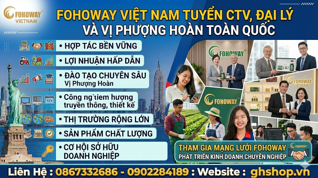 Trong bối cảnh nền kinh tế biến động và ý thức về sức khỏe của cộng đồng ngày càng nâng cao, ngành Y học dưỡng sinh công nghệ cao đang trở thành "mảnh đất màu mỡ" cho những nhà đầu tư thông minh. Fohoway Việt Nam – với hệ sinh thái sản phẩm đột phá và mô hình kinh doanh bền vững – chính thức phát lệnh tuyển cộng tác viên (CTV) đại lý và chuỗi Vi Phượng Hoàng trên toàn quốc.