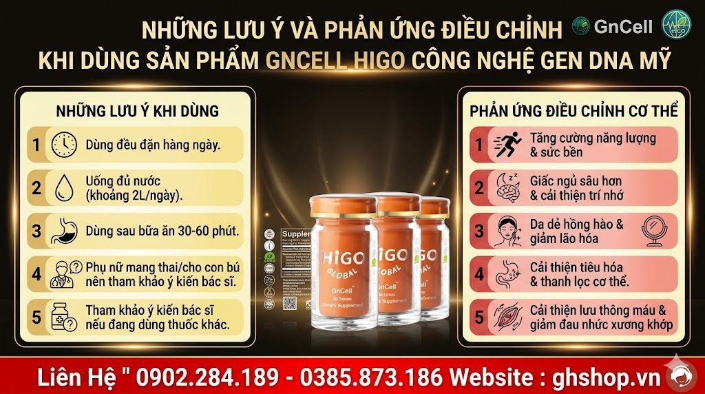 • Liều lượng: 3-4 viên mỗi ngày (tùy theo hướng dẫn cụ thể trên bao bì hoặc chỉ định của chuyên gia Higo). Có thể kết hợp với GnAKG và GnHormone để tăng hiệu quả.